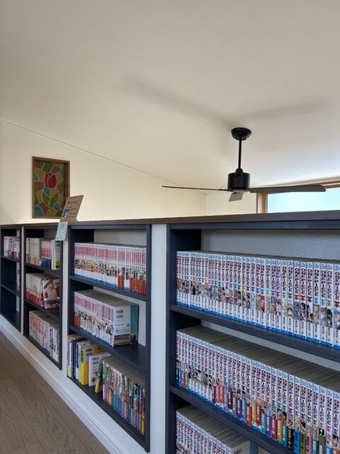 階段上がったホールの壁一面の本棚